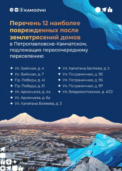 Утвержден перечень из 12 многоквартирных домов в Петропавловске-Камчатском, наиболее пострадавших в результате серии подземных толчков. Эти объекты определены как первоочередные для расселения.