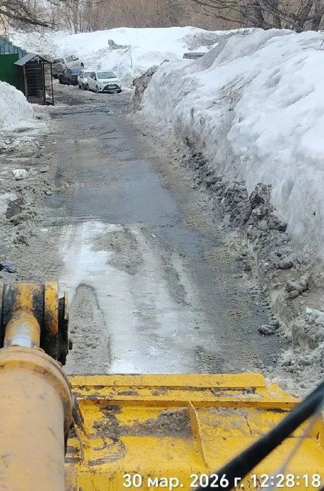 30 марта 2026 года специализированная техника продолжает расчистку проездов и придомовых территорий от снежных масс, а также обработку покрытий пескосоляной смесью в Петропавловске-Камчатском.