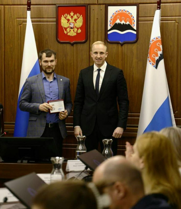 В ходе торжественной церемонии Денис Прудкий вручил Памятный знак губернатора Сахалинской области «В честь 80-летия Курильской десантной операции» начальнику отдела реализации молодёжных проектов Министерства по делам молодёжи Камчатского края Анастасии Игоревне Дзюбе и директору АНО «Камчатский центр реализации молодёжных проектов «Экосистема» Петру Викторовичу Скрипнику.