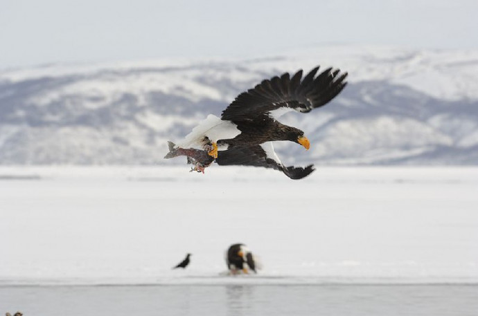 Иногда зимой здесь скапливается до 700 белоплечих орланов, что представляет собой крупнейшую в мире естественную концентрацию этих птиц. Конкуренцию на озере им составляют также занесённые в Красную книгу России беркуты.