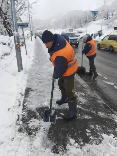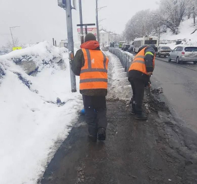 Днём к работе приступили бригады ручного труда: они расчищали тротуары, остановки общественного транспорта и пешеходные переходы на улицах Сапун-гора, Океанская, Петропавловское шоссе, Индустриальная и Красная сопка.