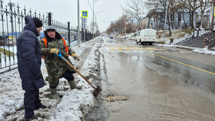 В Петропавловске-Камчатском продолжаются работы по ликвидации последствий мощного циклона, который сопровождается сложными погодными условиями с сочетанием мокрого снега, дождя и штормового ветра.