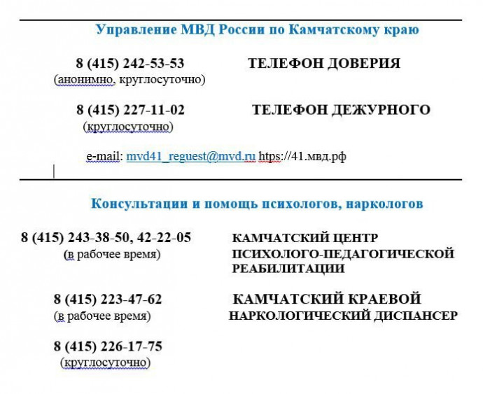 Жителей края призывают не оставаться в стороне от судьбы близких, родных и друзей. Если кому-либо известно о местах продажи или потребления наркотиков, предлагается анонимно и круглосуточно сообщить об этом по телефону доверия камчатской полиции 8 (415) 242-53-53.