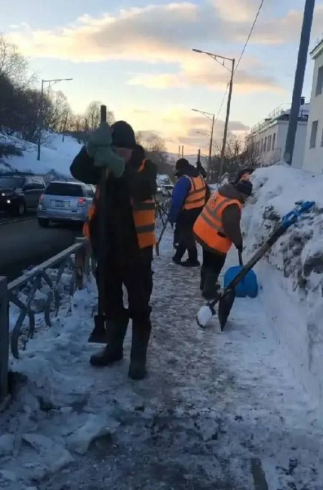 Дорожные рабочие очищали тротуары на Ленинградской и Океанской вручную.