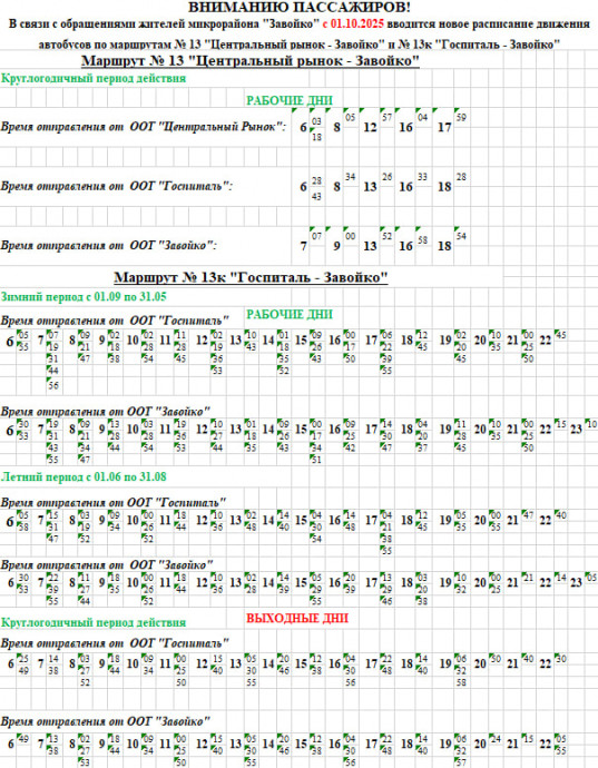 В управлении транспорта администрации Петропавловск-Камчатского городского округа сообщили о введении с 1 октября 2025 года нового расписания для автобусных маршрутов № 13 «Центральный район – Завойко» и № 13к «Госпиталь – Завойко».