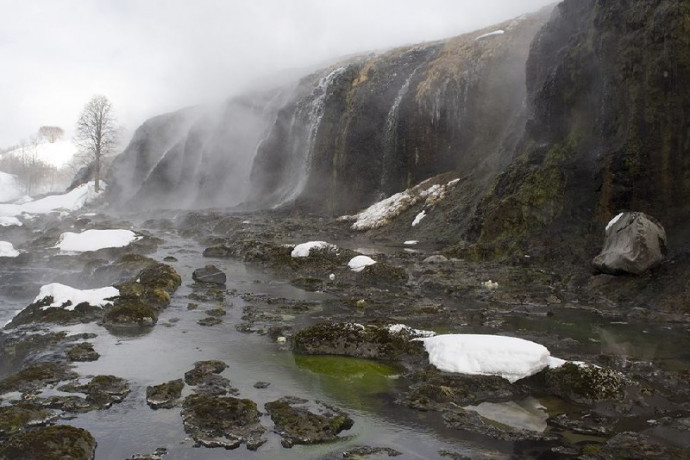 – большие Тюшевские источники, где вода температурой около 60 °C стекает каскадом по каменному утёсу;