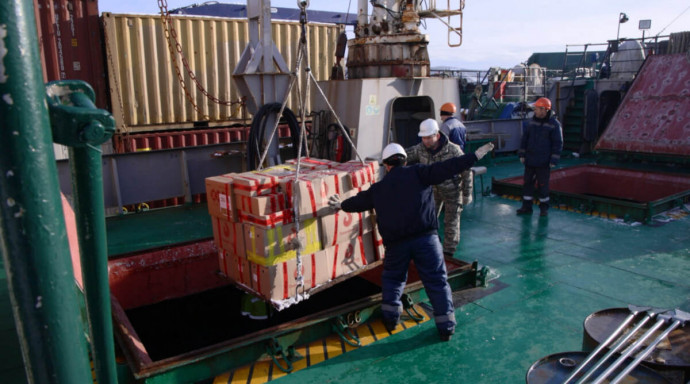 Погрузка продовольствия на судно «Василий Завойко» идет в Петропавловске-Камчатском