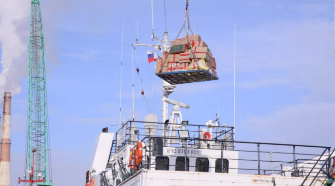 В порту Петропавловска-Камчатского продолжается погрузка продовольственных товаров на судно «Василий Завойко», предназначенных для доставки в село Никольское Алеутского муниципального округа.