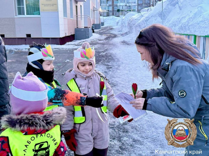 Поздравили мам с 8 Марта и напомнили о ПДД автоинспекторы и школьники на Камчатке
