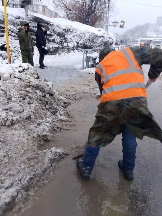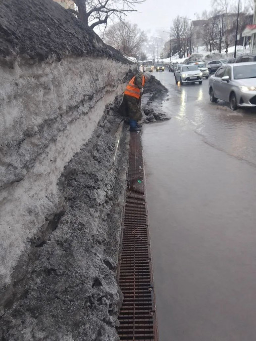 В Петропавловске-Камчатском коммунальные службы ведут работы по отводу талых вод с городских магистралей. Из-за циклона, принесшего на полуостров снег с дождем и сильный ветер, с утра 20 марта бригады ручного труда в дежурном режиме прочищают ливневые канализации.