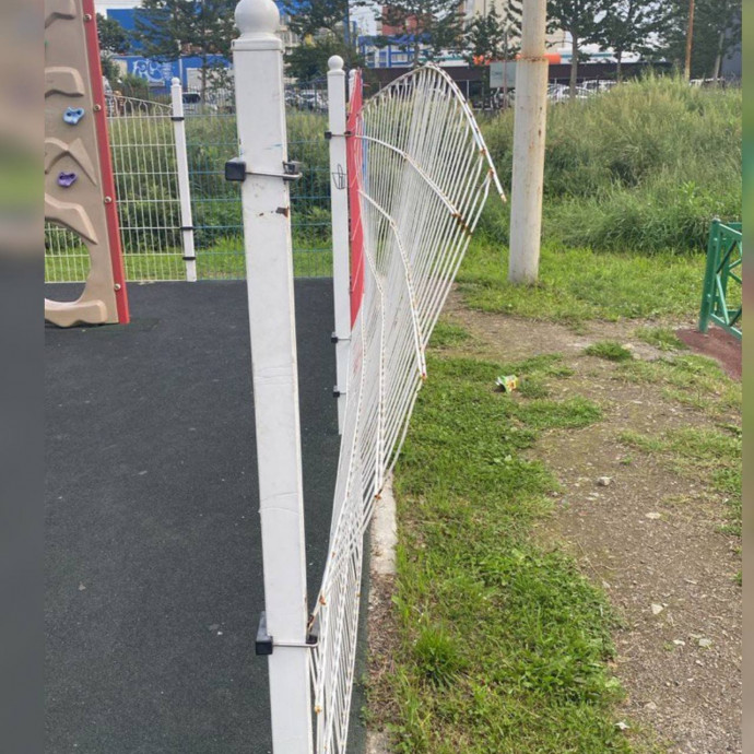 На спортивном элементе были демонтированы пластиковые кольца, при этом выступающие металлические крепления оставались не изолированными. Дополнительно выявлены существенные повреждения ограждения с наличием острых краёв, создававших опасность для детей и взрослых.