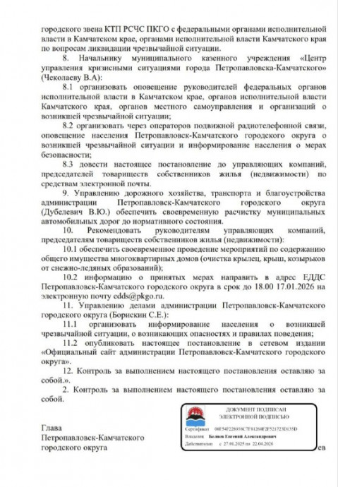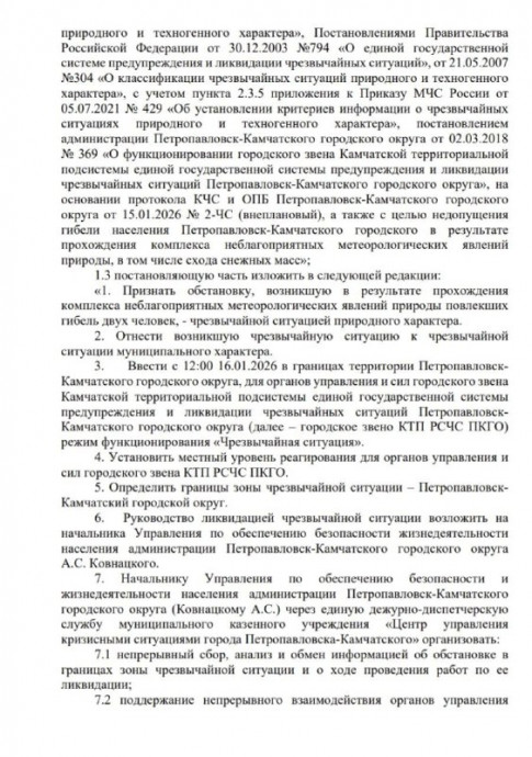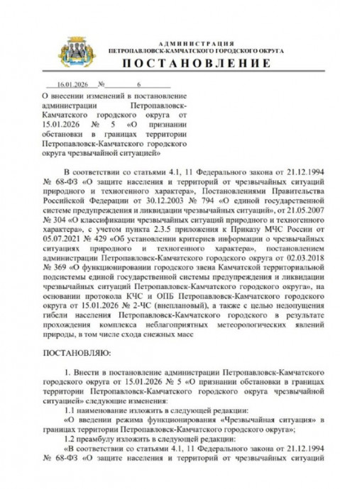 В Петропавловске-Камчатском с 16 января официально вводится режим функционирования «Чрезвычайная ситуация». Соответствующие изменения внесены в постановление городской администрации, утверждающее данный статус для территории городского округа.
