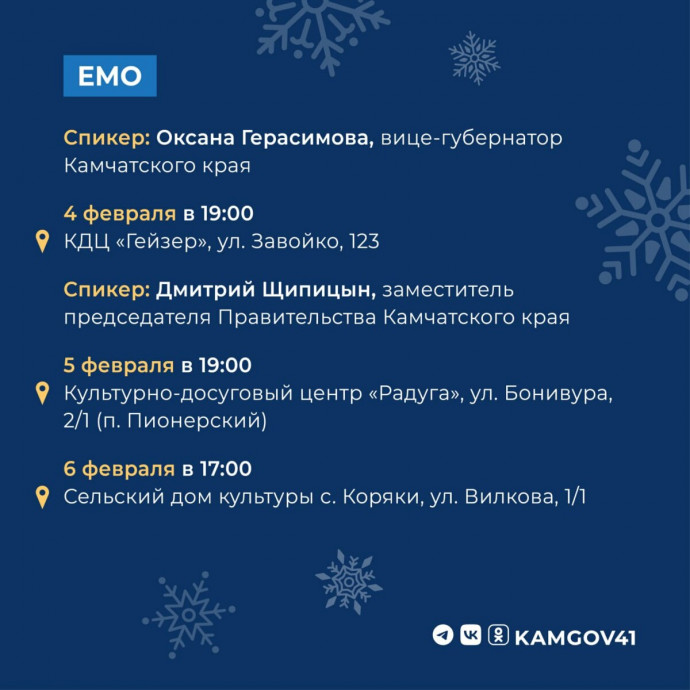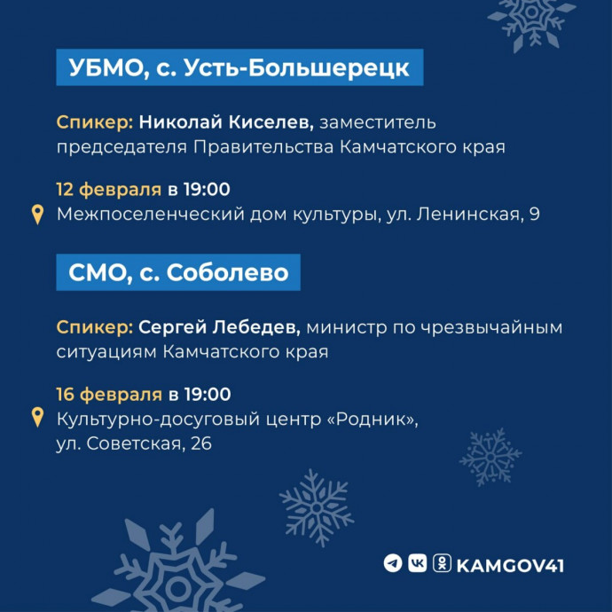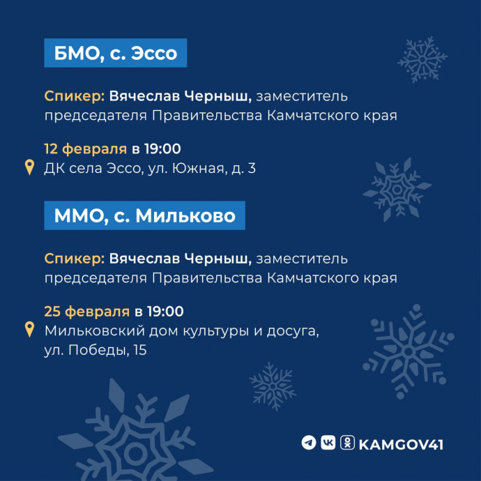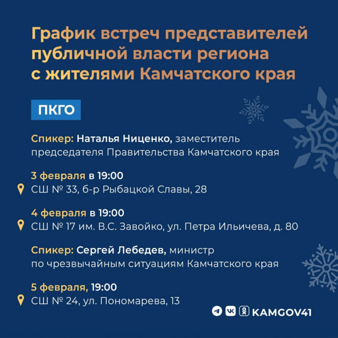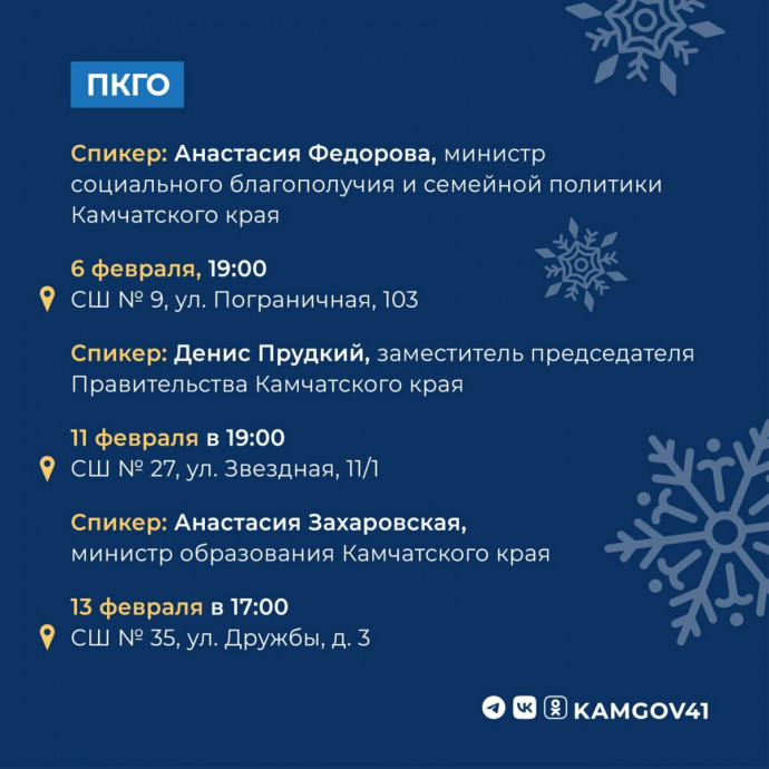 Встречи пройдут в Петропавловске-Камчатском, Елизово, Вилючинске, населённых пунктах Авачинской агломерации и других муниципалитетах края. Для проведения диалога выбраны доступные общественные пространства: школы, дворцы молодёжи и аналогичные площадки.