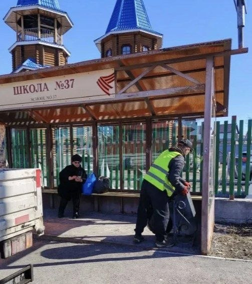 Днём на проспекте Победы убирали песок и мусор. Ежедневно ведётся очистка автобусных павильонов и прилегающих к ним зон.