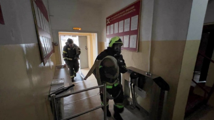 По легенде учений, возгорание на одном из этажей здания произошло из-за неисправной электропроводки. После эвакуации персонала и материальных ценностей выяснилось, что в служебном помещении остался заблокированный человек. Для проведения поисково-спасательных работ газодымозащитники использовали дыхательные аппараты и развернули рукавные линии.