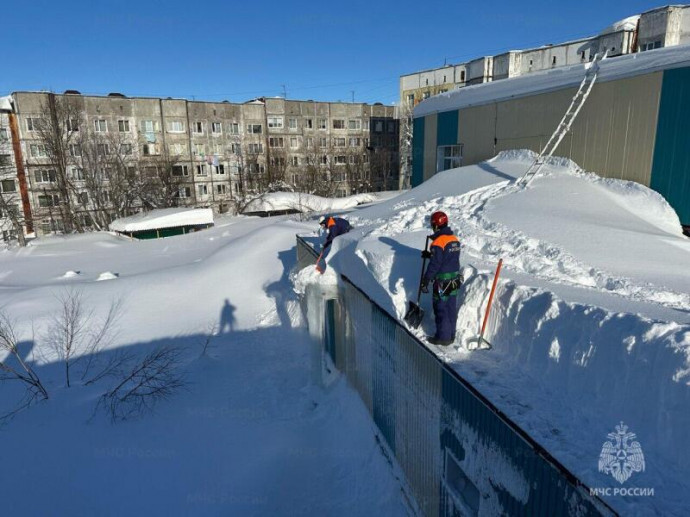 В числе основных задач — очистка кровель социально значимых объектов от накопившегося снега и наледи. Эти работы проводятся с применением альпинистского снаряжения и страховочных систем.