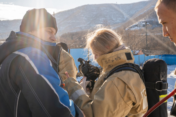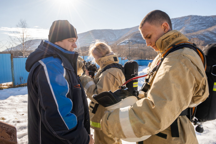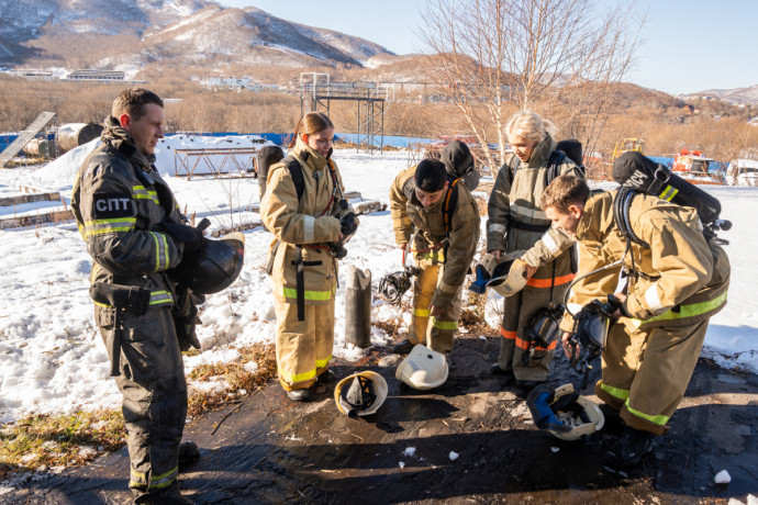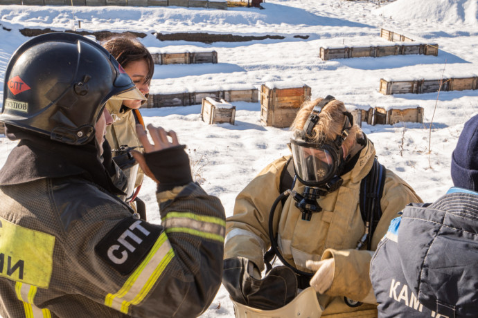 В специальной теплодымокамере примерили на себя роль пожарных школьники Камчатки