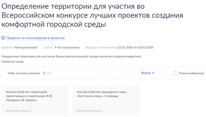 Администрация Петропавловск-Камчатского городского округа объявляет о начале общественного голосования по выбору территории для участия во Всероссийском конкурсе проектов комфортной городской среды. Голосование продлится до 2 февраля 2026 года.